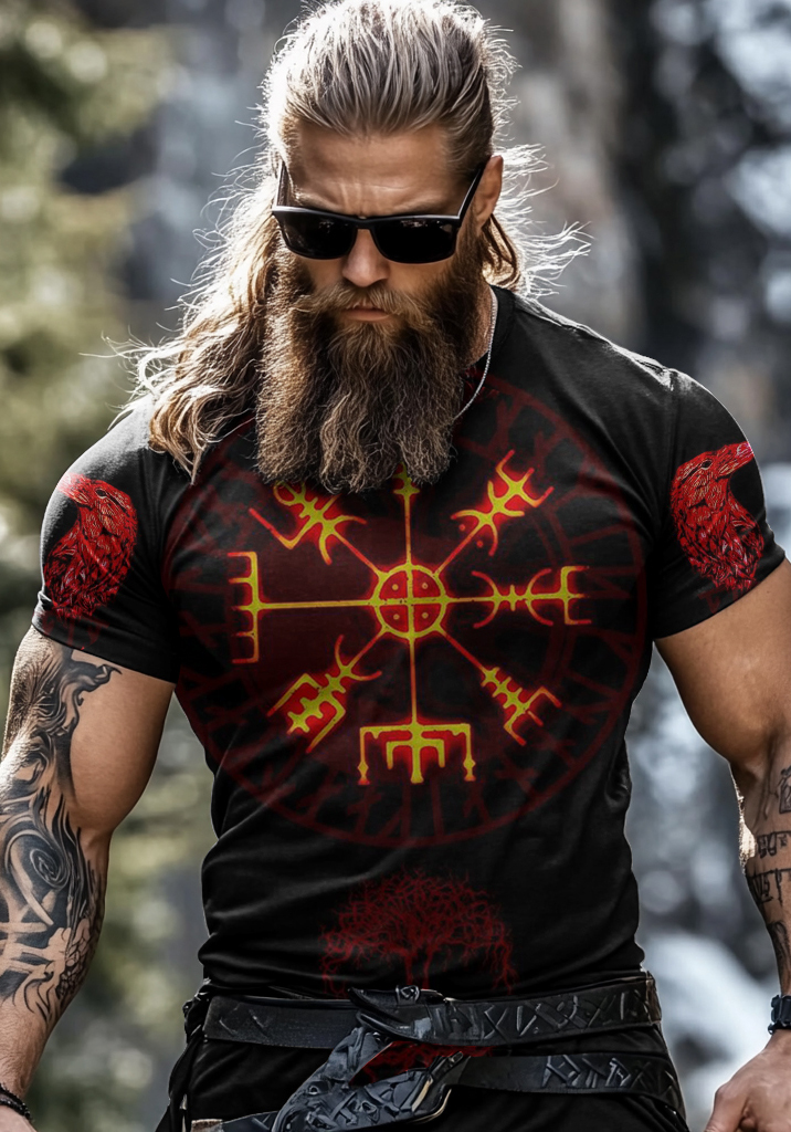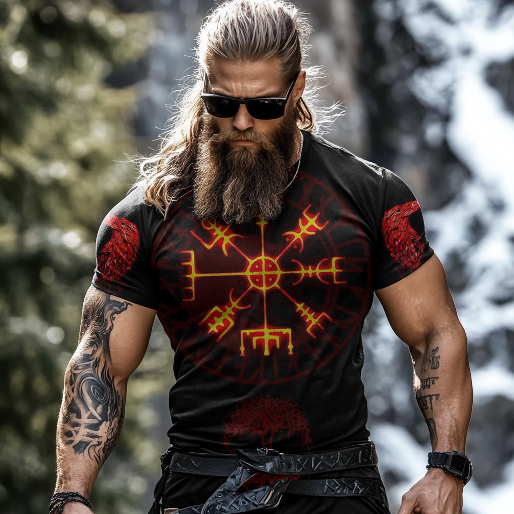 Men's Retro Viking Raven Rune Print Short Sleeve T-shirt