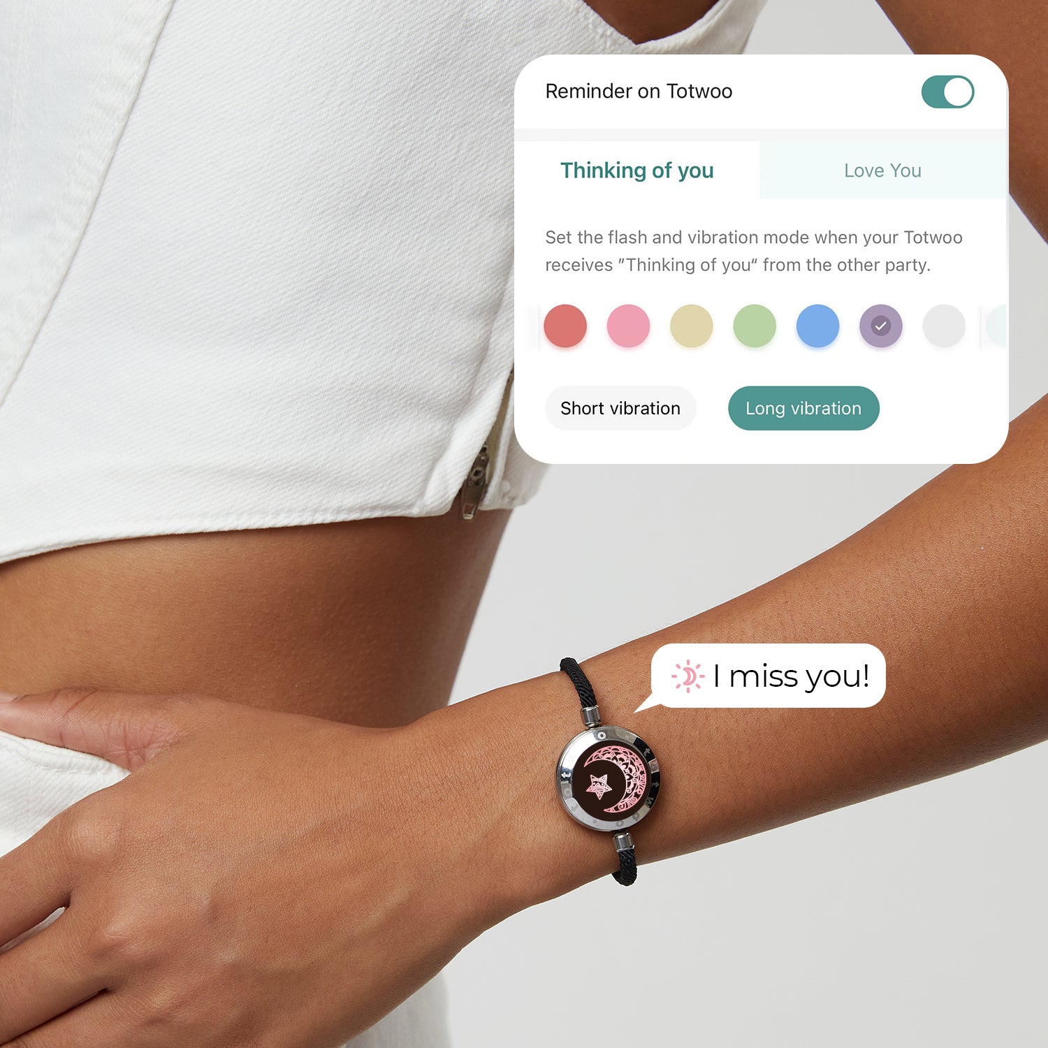 With just a simple touch, your partner's bracelet will light up and vibrate, no matter the distance. Each touch means "I am thinking of you".